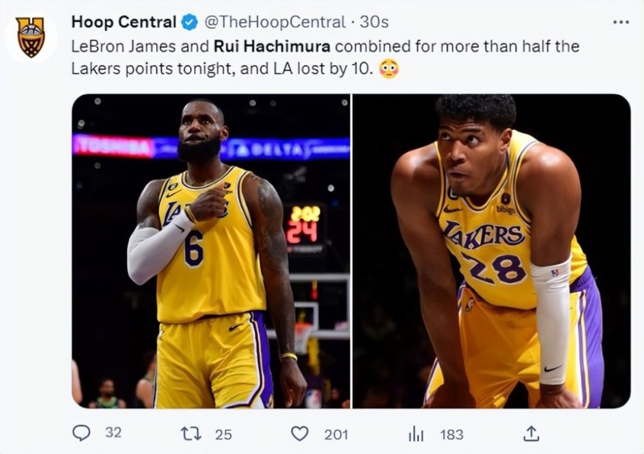 美媒赛后写道:八村垒与詹姆斯两人拿下48分超过了湖人一半的得分,但湖人最终还输掉了10分。
