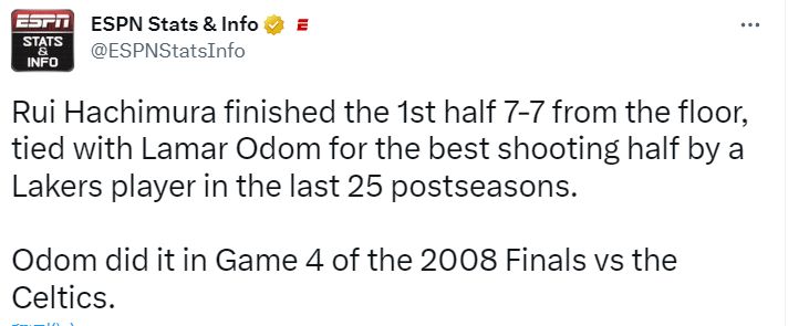 上半场结束八村垒7投7中,拿下双方最高的17分,得分创个人生涯季后赛上半场新高。湖人过去25年的季后赛,只有2008年总决赛G4的奥多姆有过类似完美的上半场投篮表现。八村垒的火热表现也引起了美媒热议。