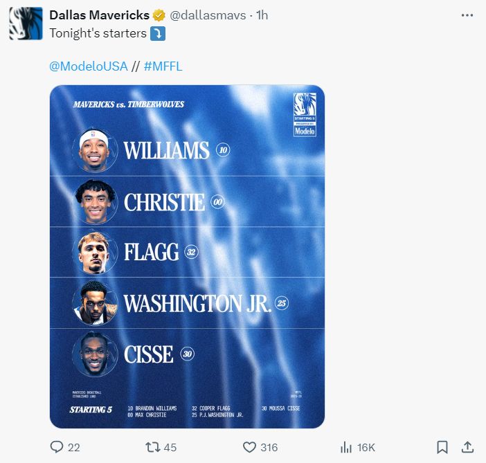 独行侠:弗拉格、华盛顿、克里斯蒂、西塞、布兰登-威廉姆斯;