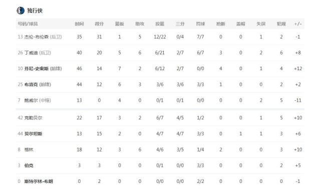 独行侠这边布伦森31分5助攻,丁威迪20分6助攻5篮板,史密斯14分7篮板,布洛克12分6篮板,克勒贝尔17分3篮板,贝尔坦斯15分,约什-格林12分6助攻。