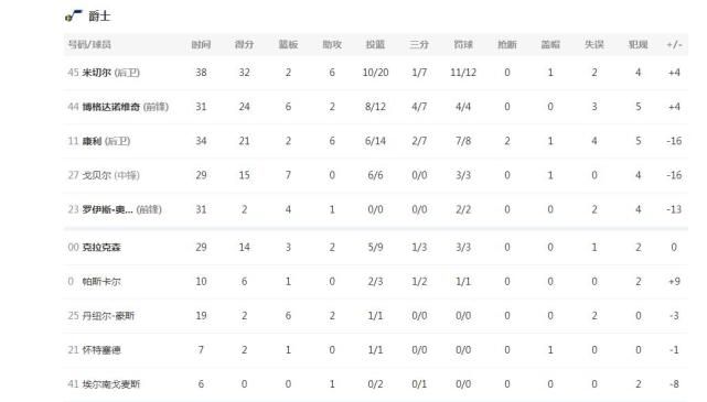 爵士这边米切尔32分6助攻,博扬24分6篮板,戈贝尔15分7篮板1盖帽,康利21分6助攻,克拉克森14分3篮板;