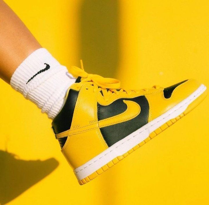 Nike Dunk High Black Varsity Maize经典黑黄配色,整体鞋身皆以质感上乘的皮革制成,黑色部分以光滑皮面,黄色的部分则以压纹荔枝皮带出层次感,最后搭配上对应的黑色中底和黄色外底,展现出有别于 Nike Dunk Low 更霸气的外观。