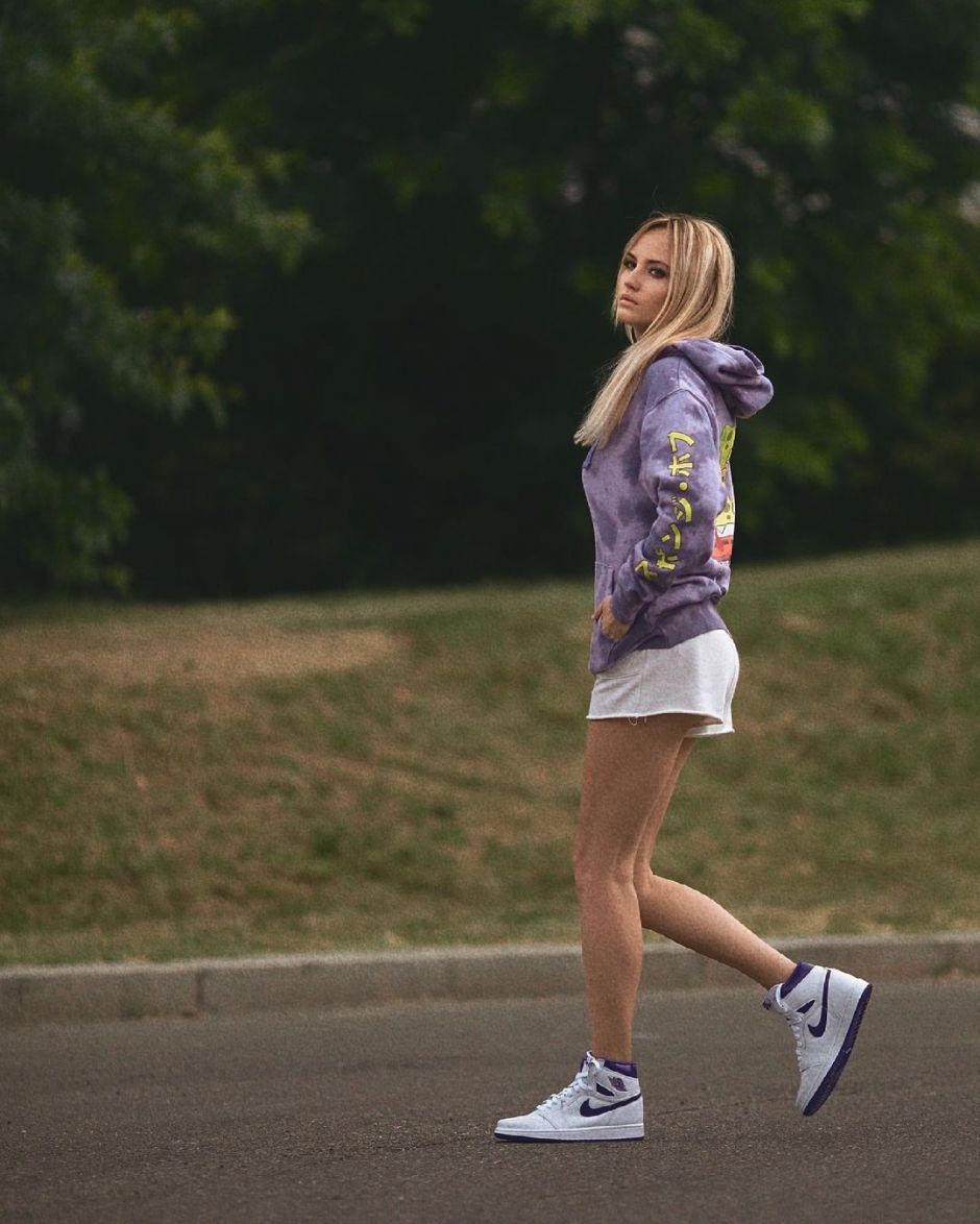 Air Jordan 1 Retro High Court Purple 这双鞋子鞋面以白色为主题,在Swoosh飞翼等细节使用紫色,是一款女生专属款,白紫配色感觉有甜甜的葡萄味,在炎热的夏天换上不同的鞋带作为点缀,让人眼前一亮给人以清新简单的感觉。