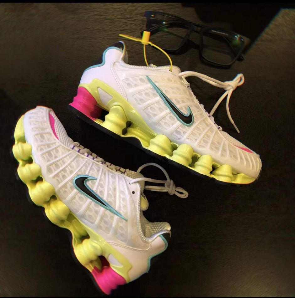 Nike Shox TL White Multi-Color颜值非常高,觉得应该是女神穿搭必备吧,特别清新,增高效果肉眼可见,鞋面采用细网纱,气柱鞋底,非常轻盈。
