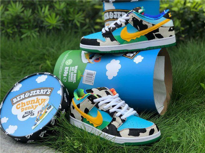 Ben & Jerry's x Nike SB Dunk Low Pro QS这款Dunk设计上有非常多的元素,简直比定制还要精彩,整双鞋采用经典的dunk sb low为蓝本,设计灵感来源于冰淇淋包装蓝天白云草原以及牛奶等经典标志性元素呈现现在的鞋面,其黑白相间的奶牛造型处采用人造马毛材质打造。