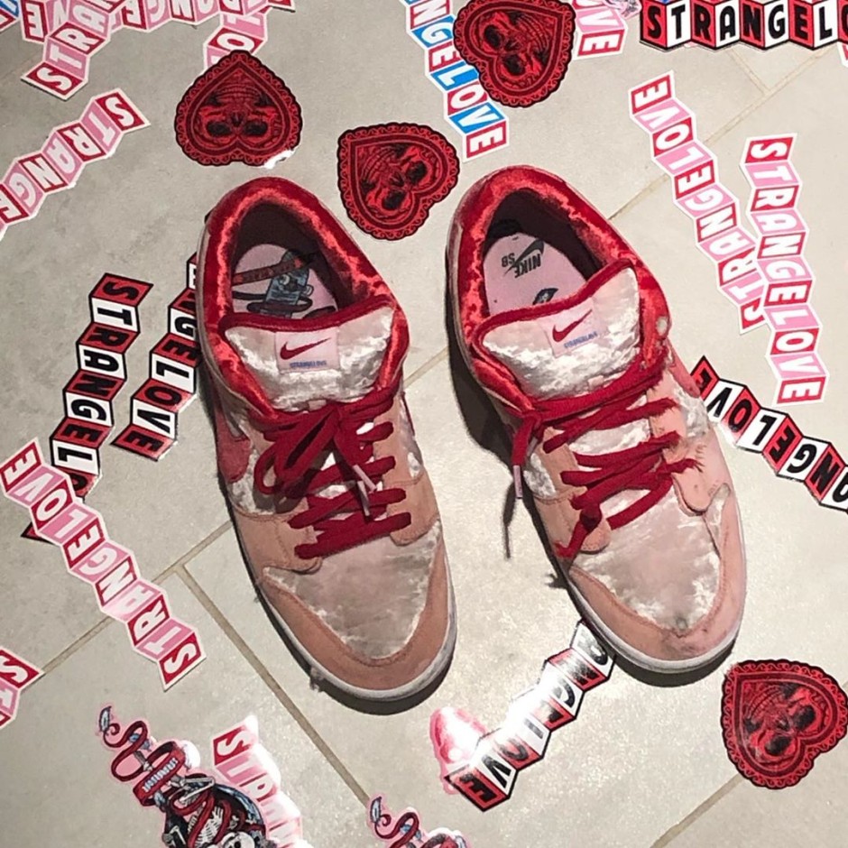 这款Nike SB Dunk Low StrangeLove Skateboards淡粉鞋身辅以鲜红 Swoosh,甜蜜的氛围让人倍感轻松。 从外到内都大量运用了丝绒材质,独特的光泽质感让人耳目一新,每个角度都闪耀着情人节的甜蜜光辉,相信手感和上脚实穿的脚感也会相当不错。