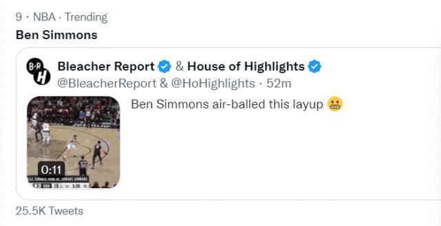 很快,西蒙斯的这记三不沾冲上了全美热搜,遭到球迷们的疯狂调侃。他的进攻确实缺乏侵略性。名记文霍斯特在最新一期节目上曾谈到西蒙斯,他说:““本赛季初有很多球探被派去密切观察西蒙斯,他们认为他缺乏侵略性不是因为害怕投丢投篮,而是害怕被犯规。”赛季至今,西蒙斯罚球10罚4中,命中率只有40%。他的生涯罚球命中率也只有59.6%。