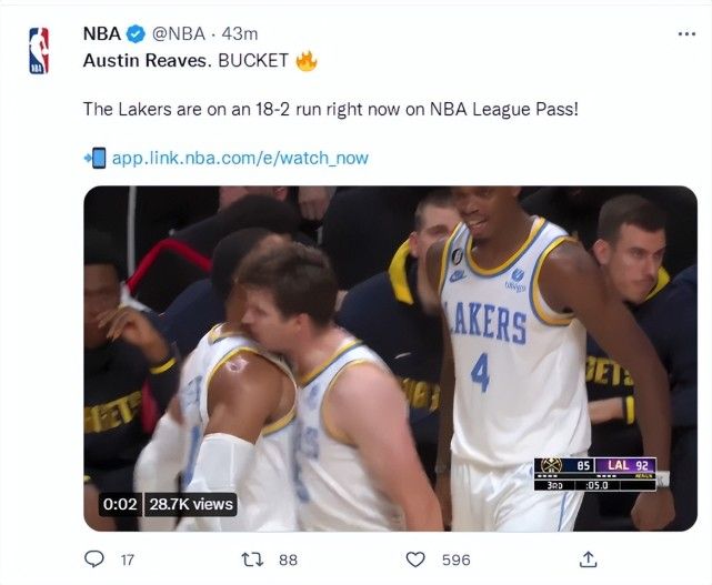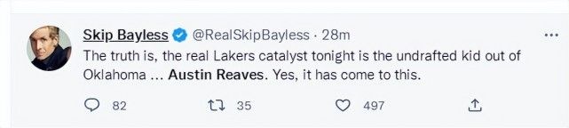 NBA‘金牌詹黑’斯利普-贝勒斯赛后还写到:事实上,今晚湖人真正的催化剂是来自俄克拉荷马没有被选中的孩子奥斯汀-里夫斯。是的,湖人已经沦落到这个地步了。