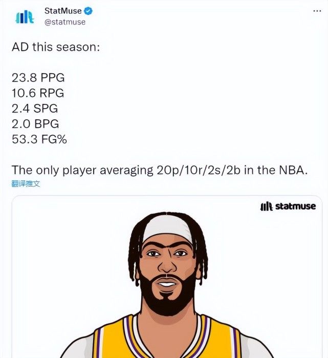 这个赛季浓眉哥场均得到23.8分10.6篮板2.0助攻2.2抢断2.0盖帽,投篮命中率53.3%。浓眉哥是本赛季联盟唯一至少场均20分10篮板2抢断2盖帽的球员。这一组数据体现了浓眉哥进攻和防守的贡献。