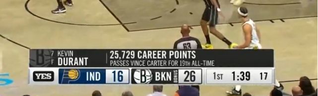 在首节比赛的末段时刻,伴随杜兰特突破被史密斯插眼防守,裁判吹罚史密斯犯规,杜兰特两罚全中之后,他职业生涯总得分已经超越卡特的25728分,升至BA历史得分榜第19位,前一位是加内特26071分。