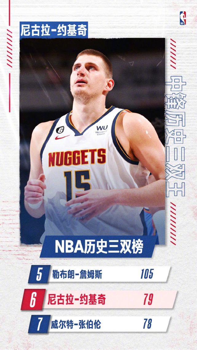 其三,约基奇79次三双独占历史第6位,超越张伯伦后,仅次于威少194次三双,罗伯特森181次三双,魔术师约翰逊139次三双,基德107次三双,詹姆斯105次三双。