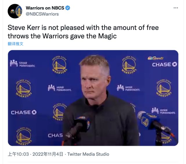 勇士主教练史蒂夫-科尔也在赛后表达自己对罚球数差距的不满: