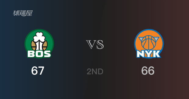 半场比分,凯尔特人以67-66领先尼克斯1分。