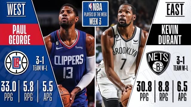 北京时间11月8日,NBA官方公布了第3周的东西部周最佳球员。篮网的杜兰特当选东部周最佳球员,这是他本赛季首次当选周最佳,生涯第30次获此殊荣。快船的乔治当选西部周最佳球员,这也是他本赛季首次当选周最佳,生涯第11次获得这一奖项。