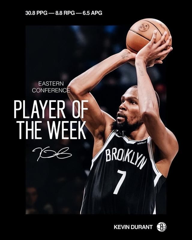 上周,篮网打出3胜1负的战绩,杜兰特场均30.8分8.8篮板6.5助攻,投篮命中率53.2%,三分命中率36.8%,罚球命中率100%。篮网官方晒图祝贺杜兰特获奖。
