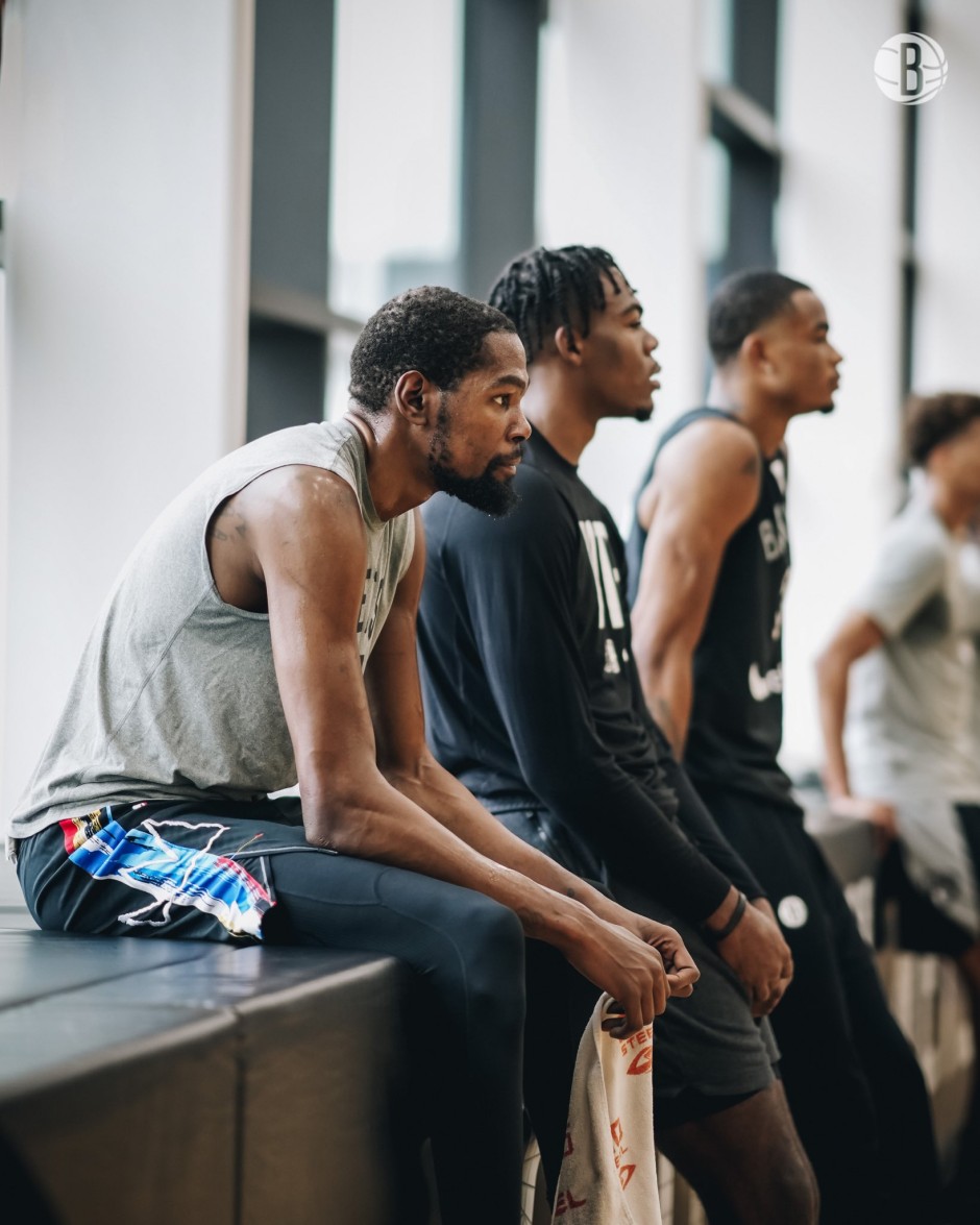 篮网方面:杜兰特、萨姆徳、克拉克斯顿、哈里斯、奥尼尔