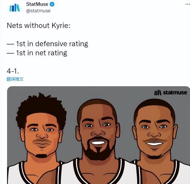 美媒statmuse列出了一组数据,本赛季欧文缺阵后,篮网防守效率第一,净效率值也是第一。