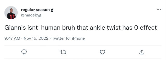 慢镜头显示,字母哥的左脚出现90度崴脚,一般球员要是碰到这种情况,肯定要伤退,说不定还要休息好几周,但字母哥竟然还能在比赛中继续上场,而且上演飞身暴扣,完全不受影响。不得不说,“希腊怪兽”的名号不是白叫的。