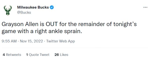球迷们在社媒上热议字母哥的这次崴脚,有球迷感慨:“扬尼斯不是人类,崴脚对他零影响。”相比字母哥,同样在本场比赛复出的格雷森-阿伦就没那么幸运了。雄鹿官方表示,由于右踝扭伤,他本场比赛不会再出战。阿伦本场打了9分钟,得到2分1篮板1抢断。