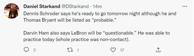 北京时间11月18日,据湖人前方记者报道,詹姆斯明日出战活塞的状态已经升级为出战成疑,而施罗德本人表示他会在明天的比赛中上场,托马斯-布莱恩特的状态也是大概率出战。