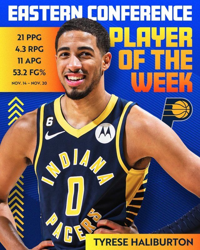 上周,步行者打出3胜0负的战绩,哈利伯顿场均贡献21分4篮板11助攻,投篮命中率53.2%。步行者官方晒照祝贺哈利伯顿生涯首次获奖。