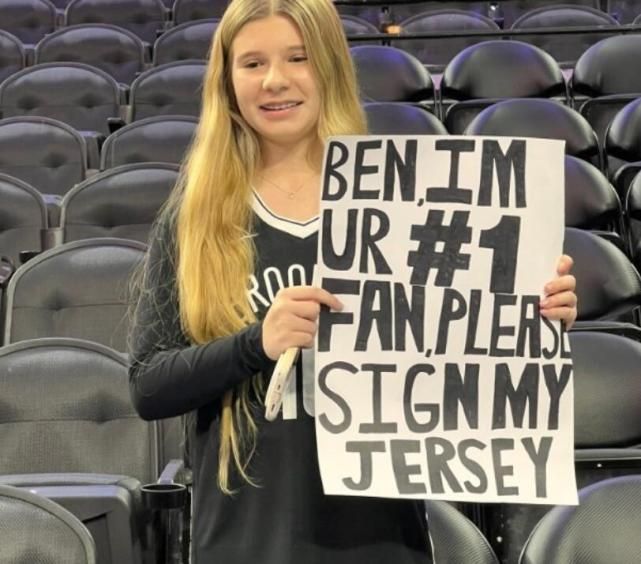西蒙斯练了罚球,还进行了转身突破等训练。训练结束后,西蒙斯心情愉快地满足了很多球迷的签名要求。一位女球迷举着牌子,上面写着“本-西蒙斯,我是你的头号球迷,请给我的球衣签个名。”西蒙斯欣然满足要求,还和这位球迷微笑合影。