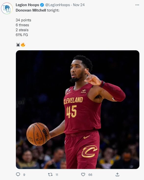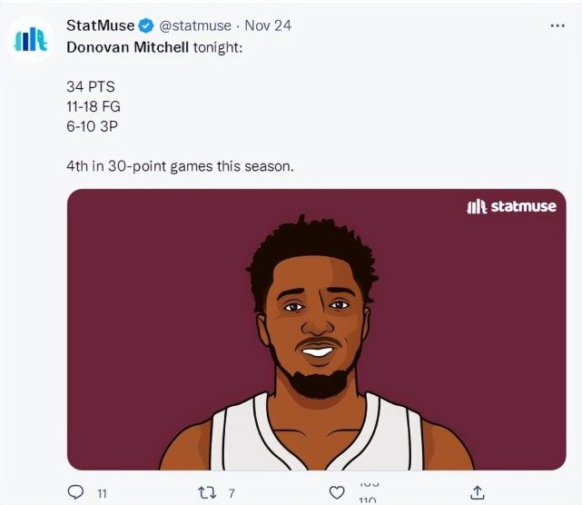 米切尔是这场比赛中发挥最为出色的球员,他仅仅前三节就拿下28分,此役之前他场均得到为29.8分,末节他休息了4分钟登场后连拿6分轻松拿下30+,场均得分再度提升到30以上,最终全场比赛30分钟,18中11,三分10中6,拿下34分1篮板1助攻。