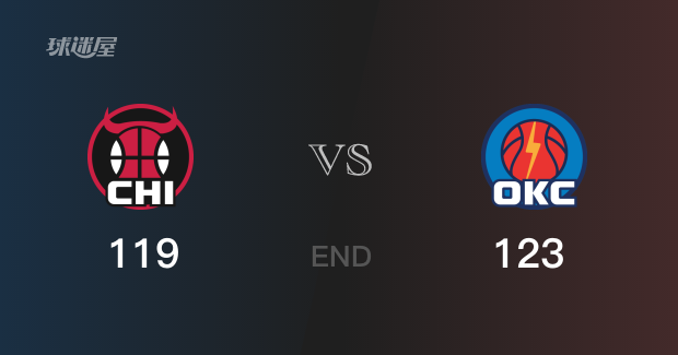 全场比赛结束,最终雷霆以123-119击败公牛,成为获胜方。雷霆球员亚历山大砍下全队最高30分,外加8篮板7助攻1盖帽、贝兹利17分3篮板2盖帽、波库15分6篮板2助攻1抢断1盖帽,他们是雷霆队里得分最高的三名球员。
