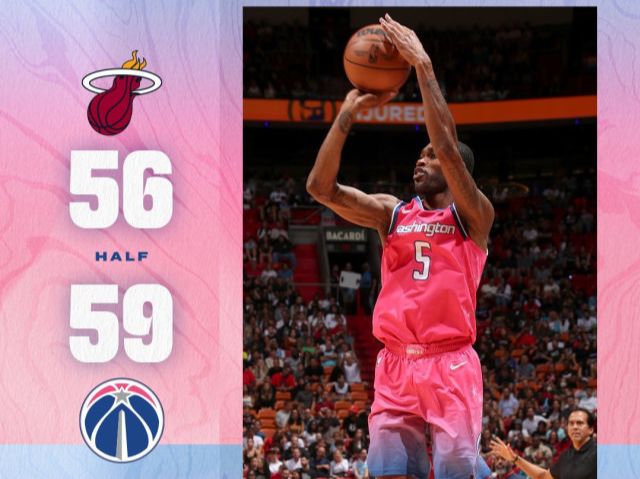 次节上来热火队多点开花打出10-3攻击波,分差被迅速缩小到3分,奇才回应一波6-0攻击波,48-39分差重新回到9分,洛瑞、海史密斯连续命中三分,在半场还剩2分钟时,热火队52-50完成反超,波神三分回应,比尔三分也有,基斯珀特三分再中,凭借三人连续命中三记三分,半场结束时,奇才以59-56手握3分领先进入中场休息。
