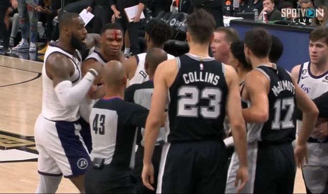第三节还剩2分钟出现了冲突,威少篮下进攻,被扎克·科林斯封盖,威少抢到进攻篮板再起身上篮,被科林斯一肘打到面部。威少跌倒在地,他起身后和科林斯对峙,队友们上来将双方分开,威少额头上鲜血直流。裁判看了录像回放之后,判罚恶意犯规将科林斯驱逐出场,威少被吹了技术犯规。