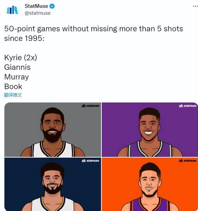 第五,布克只投丢5球砍下51分,自1994-95赛季以来,仅四位球员曾做到过在单场比赛里砍下50+得分,且投失次数不超过5次,他们分别是:欧文、字母哥、贾巴尔·穆雷和布克。