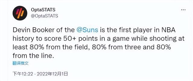 北京时间12月1日,太阳132比113击败公牛,布克在缺少保罗的情况下,继续带队赢球,他轰下51分4篮板6助攻,25投20中,三分球7投6中,创造了一系列神迹。
