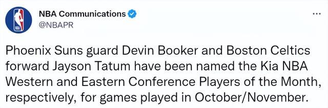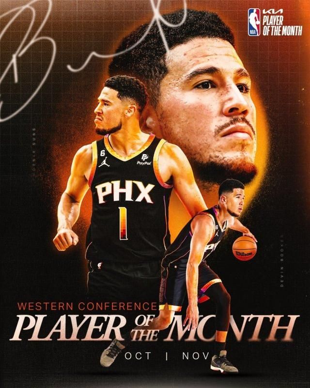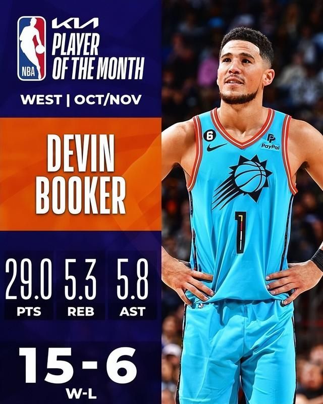 本赛季的第一次西部月最佳球员奖项属于太阳的布克。10-11月的比赛中,布克场均29分5.3篮板5.8助攻,率领太阳打出15胜6负的西部最佳战绩。太阳官方晒照祝贺布克获奖。