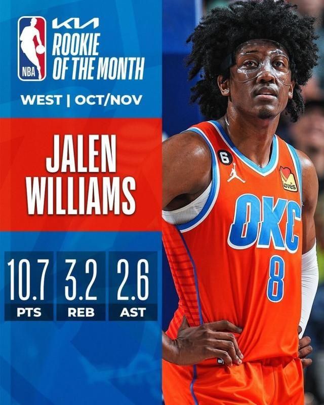 本赛季的第一次西部月最佳新秀奖项,属于雷霆的12号秀杰伦-威廉姆斯。他在18场比赛里场均10.7分3.2篮板2.6助攻,投篮命中率52.4%。
