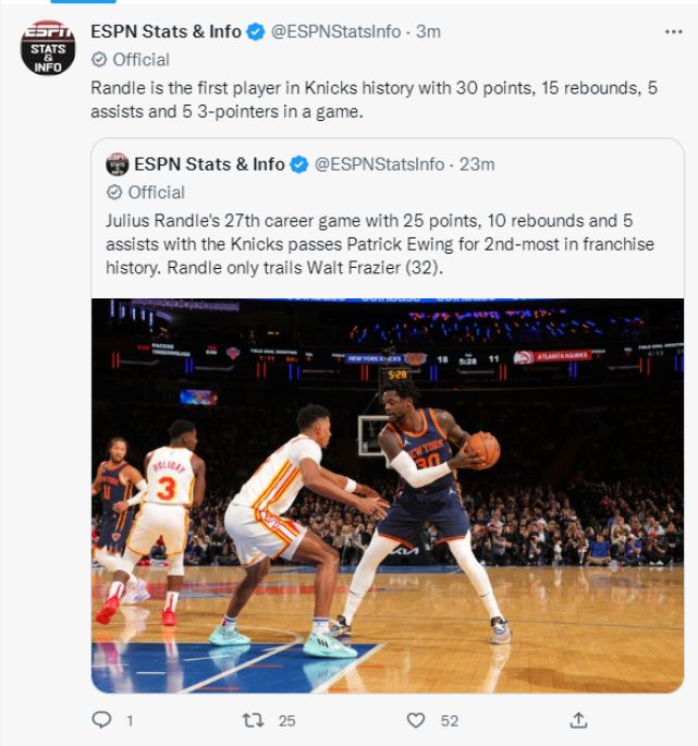 此役他也创造纪录:他在尼克斯拿下第27场25分+10篮板+5助攻,超过尤因成为队史第二多25+10+5的球员,仅次于弗雷泽的32次。