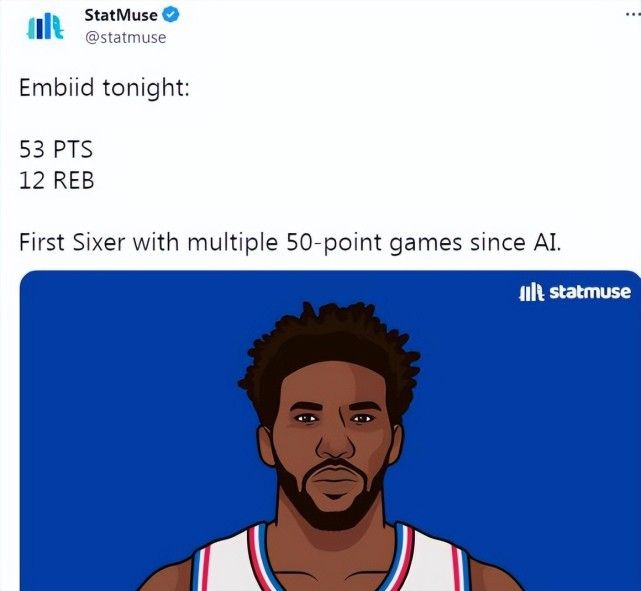 第二,恩比德本赛季第二次砍下50+,成为自2004-05赛季的艾弗森之后,首位单赛季多次砍下50+的76人球员。