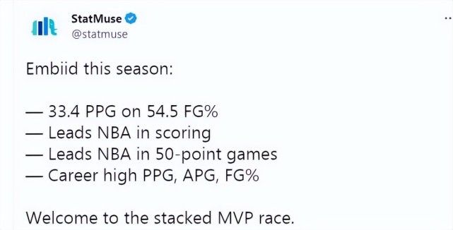 恩比德赛季初受到伤病困扰,状态不佳,但是现在他恢复了健康,接连砍下高分。美媒statmuse列出了恩比德的数据,并且表示:“欢迎回到MVP竞争行列。”