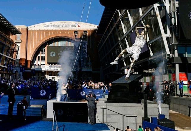 北京时间12月26日,在圣诞大战这一天,达拉斯独行侠为诺维茨基打造的雕像正式揭幕。它矗立在美航中心门口,那是一座高达7米的青铜雕像,造型正是这位名人堂球员的招牌动作:金鸡独立式的后仰跳投。