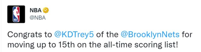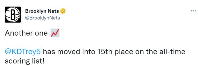 本场比赛前,杜兰特只差13分超越邓肯。比赛首节,杜兰特开场就命中一记三分,随后,他又命中了一记高难度的后仰中投。首节结束前1分多钟,杜兰特连投带罚,连得7分。他在首节得到12分,追平了邓肯。半场结束前6分52秒,杜兰特被换上场。很快,他用一记中投命中,超越邓肯,独占历史第15位。