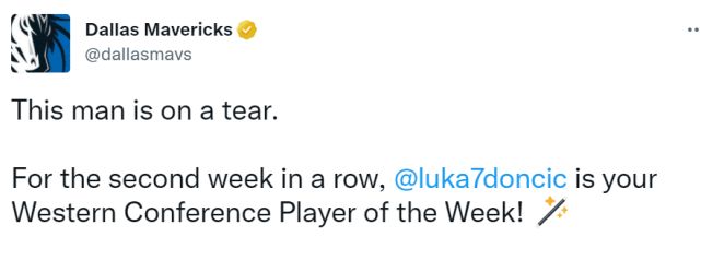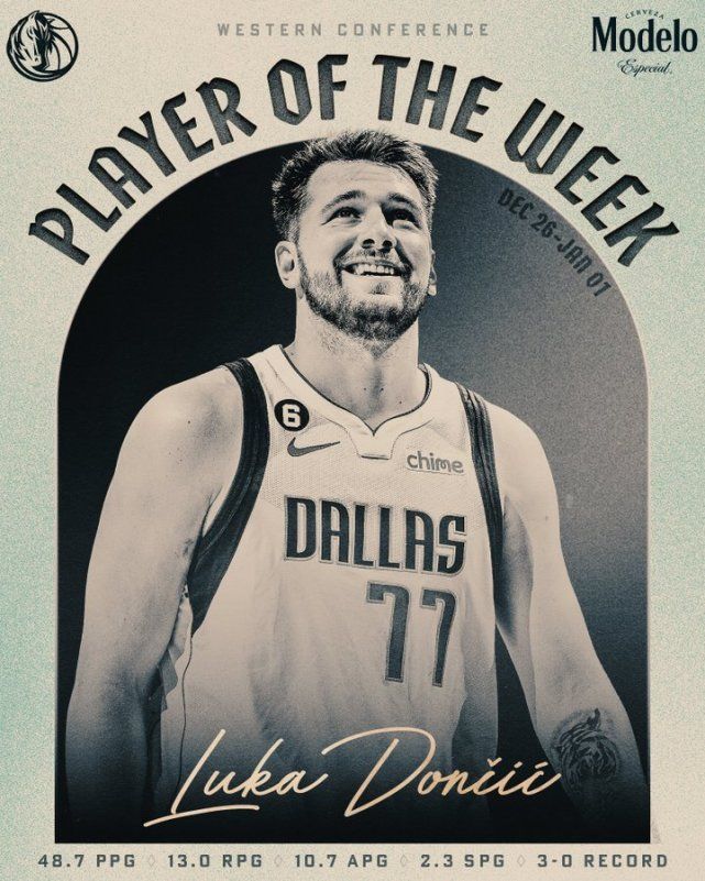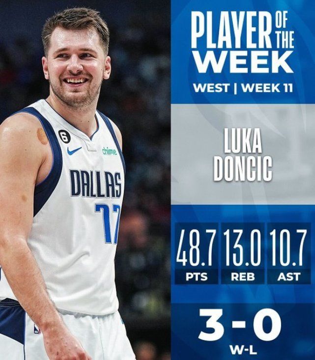 上周,独行侠3胜0负,东契奇场均48.7分13篮板10.7助攻,投篮命中率61.7%,三分命中率48%。独行侠官方晒图祝贺东契奇蝉联周最佳,他也是第10周的西部周最佳球员。