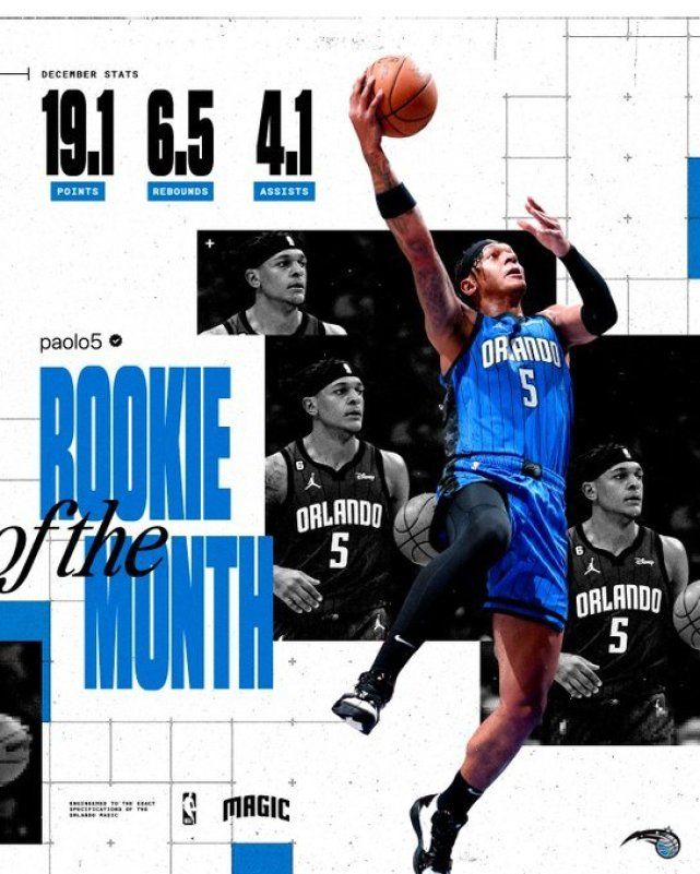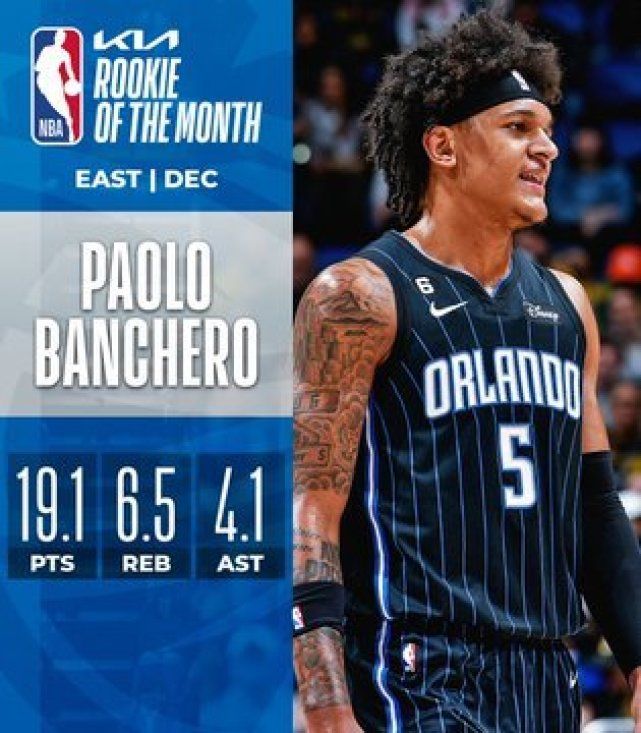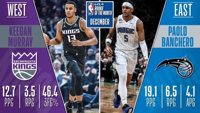 12月的东部月最佳新秀,属于魔术的状元秀班凯罗。12月的比赛中,班凯罗场均贡献19.1分6.5篮板4.1助攻。魔术官方晒图祝贺班凯罗获奖。