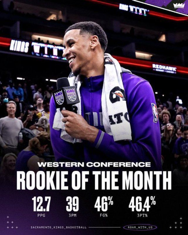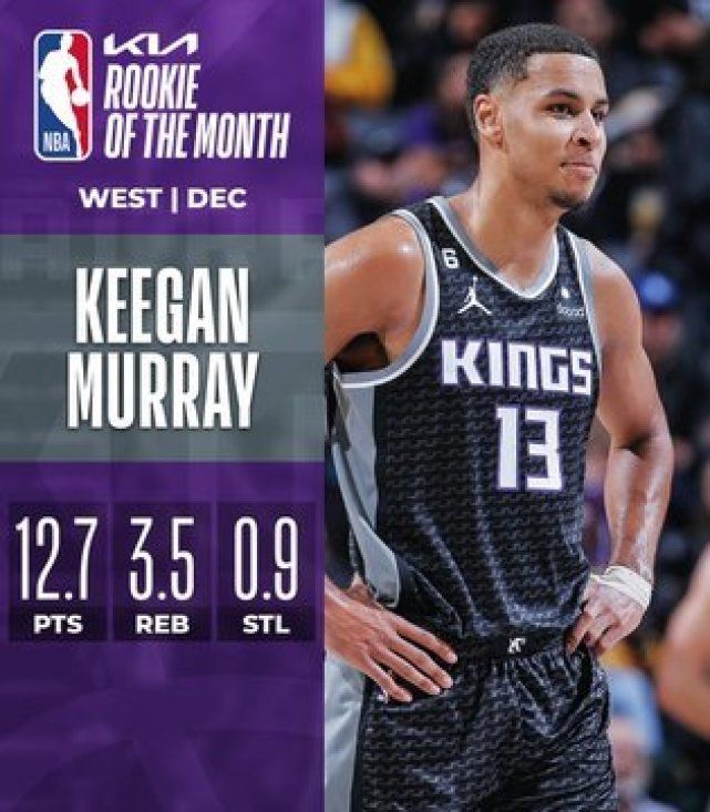 12月的西部月最佳新秀,属于国王的4号秀默里。12月的比赛中,默里场均12.7分3.5篮板,三分命中率46.4%。国王官方晒图祝贺默里获奖。