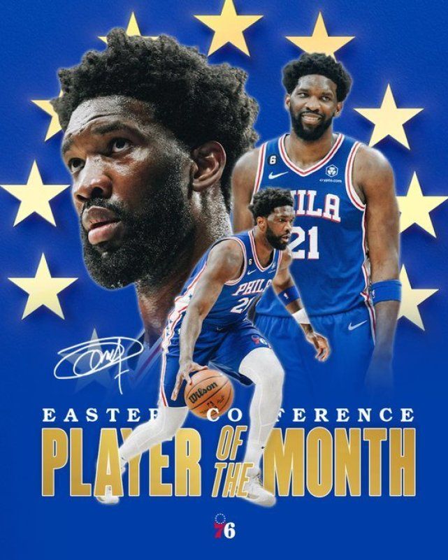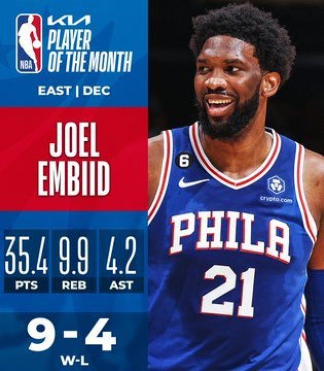 12月的东部月最佳球员属于76人的恩比德,他在这个月场均35.4分9.9篮板4.2助攻,率领76人打出9胜4负的战绩,76人官方晒图祝贺恩比德获奖。这是恩比德生涯第5次当选月最佳球员。