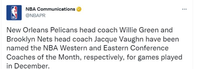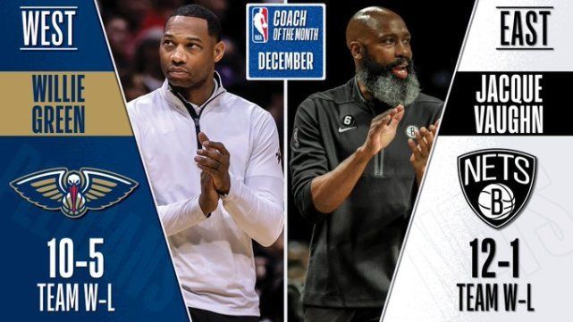 12月的月最佳主教练分别属于东部的篮网主帅沃恩和西部的鹈鹕主帅格林。沃恩在12月率领篮网打出12胜1负的战绩,而格林在12月率领鹈鹕打出10胜5负的战绩。