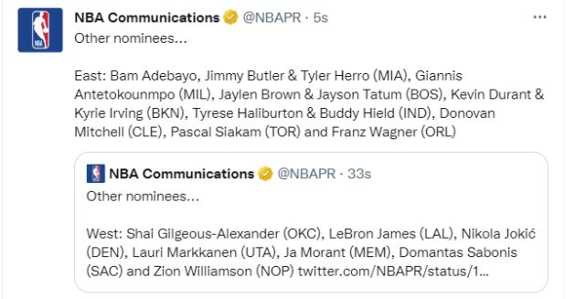 东部:阿德巴约、巴特勒、希罗、字母哥、布朗、塔图姆、杜兰特、欧文、哈利伯顿、希尔德、米切尔、西亚卡姆、小瓦格纳