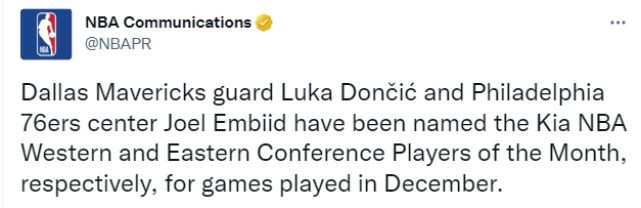 NBA官宣12月最佳奖项:恩比德东契奇当选月最佳 班切罗默里月新秀