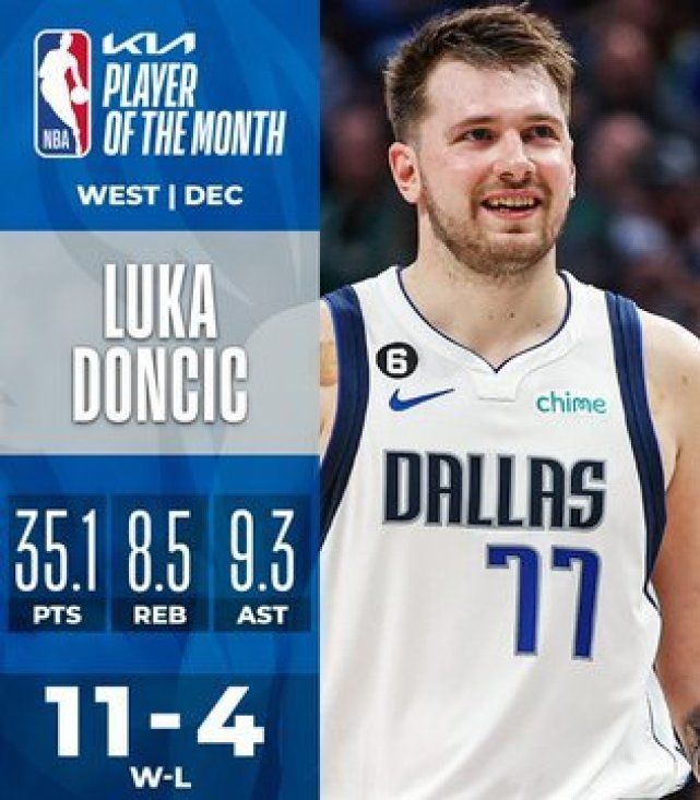 12月的西部月最佳球员属于独行侠的东契奇,他在这个月场均35.1分8.5篮板9.3助攻1.6抢断,率领独行侠打出11胜6负的成绩。这是东契奇本赛季首次当选月最佳,生涯第3次当选月最佳球员。独行侠官方晒照祝贺东契奇获奖。