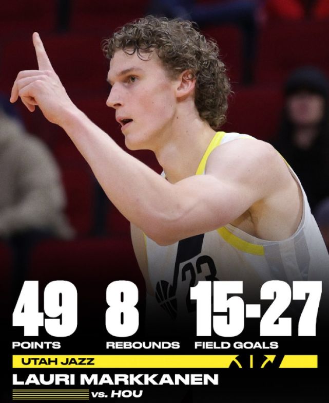 不过如今面对摆烂重建的火箭对决,爵士用一场17分大胜轻取火箭,而马尔卡宁则是打出生涯最佳一战。此役,马尔卡宁出战35分钟,奉献27中15的投篮,其中外线三分15中6,外加罚球13中13,狂轰49分8篮板2助攻1盖帽。