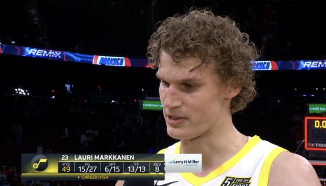 其二,马尔卡宁49+8的表现,成为自从1990年以来爵士第3人,比肩邮差马龙与米切尔。