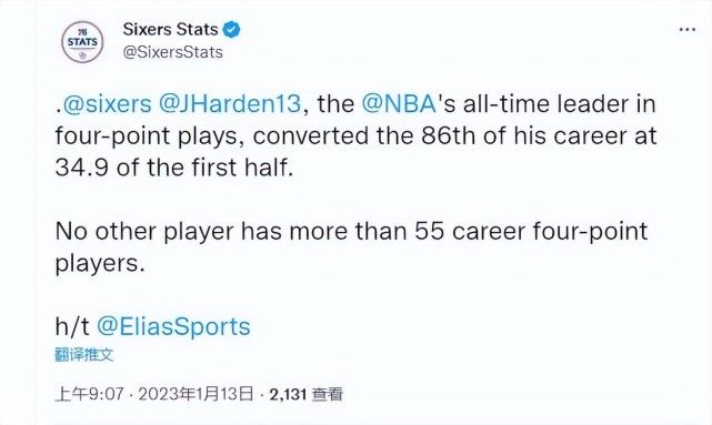 76人官方统计,这是哈登职业生涯至今第86次打成3+1,排名NBA历史第一,其他球员没有人的3+1次数超过55次,被哈登远远甩在了身后。
